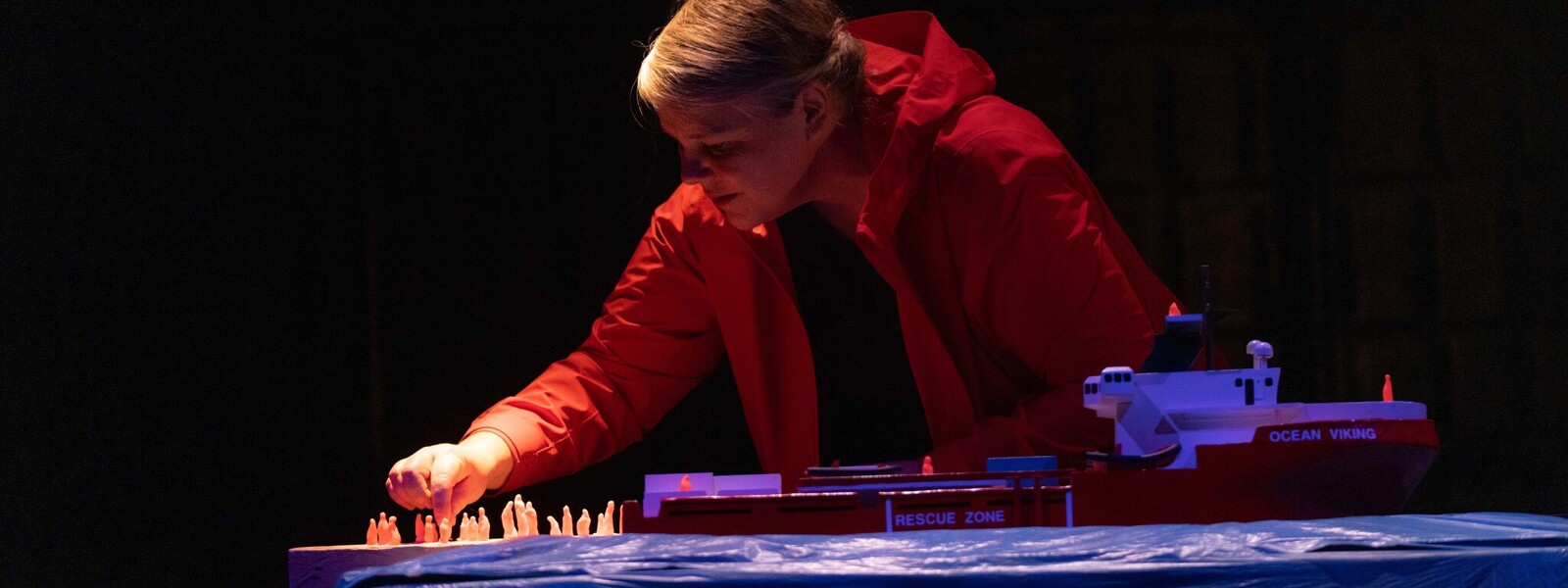 Dans Esquif (à fleur d’eau), la mer Méditerranée sort du silence. Elle parle et nous confie avec un soin extrême les mémoires, espoirs et chants de femmes, d’hommes et d’enfants sauvés par l’Océan Viking, navire ambulance de l’ONG SOS Méditerranée. Aux côtés de la Mer, incarnée par une comédienne, une violoncelliste accompagne l’histoire de ses notes profondes.