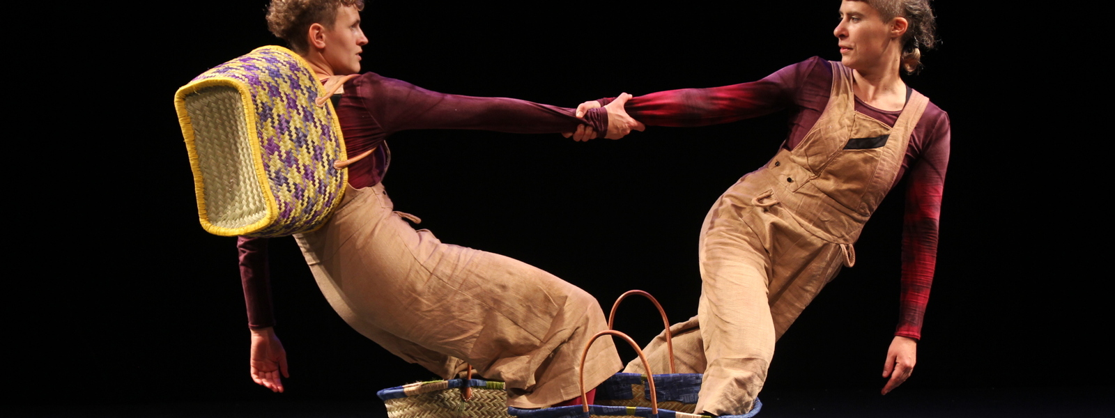 Manon Froger et Temmah Lindo, danseuses, s’amusent à détourner des paniers, objets du quotidien, pour faire naître un monde inconnu où déambulent personnages loufoques et animaux fabuleux à la Claude Ponti.