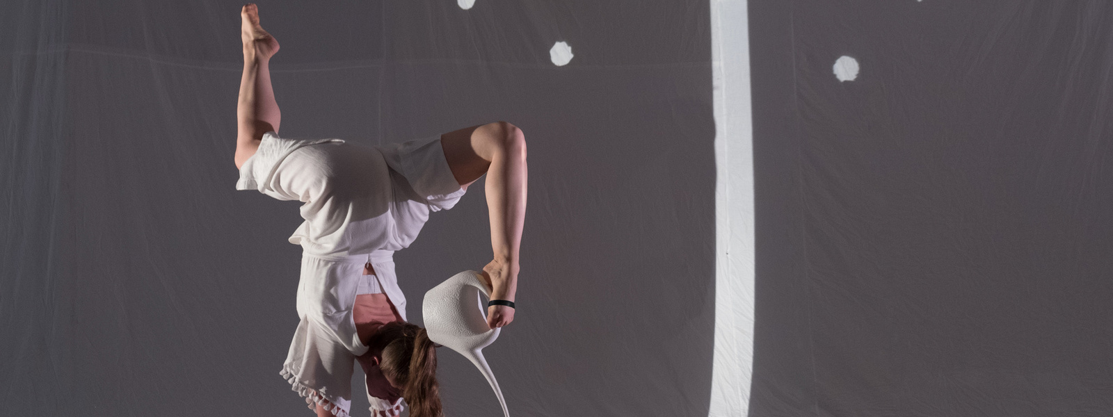 Dans une atmosphère épurée, inspirée du livre jeunesse « Três pontinhos »* de l’auteur et illustrateur brésilien Mario Vale, deux personnages nous guident au cœur d’un monde sans parole. Grâce au procédé quasi artisanal de la vidéoprojection, la scène à la blancheur immaculée se métamorphose en une page vierge où tout semble alors possible. La lune se transforme en balles de jonglage… puis en graines… qui s’élancent comme autant de lignes de fuite porteuses d’illusions que l’on croirait infinies.