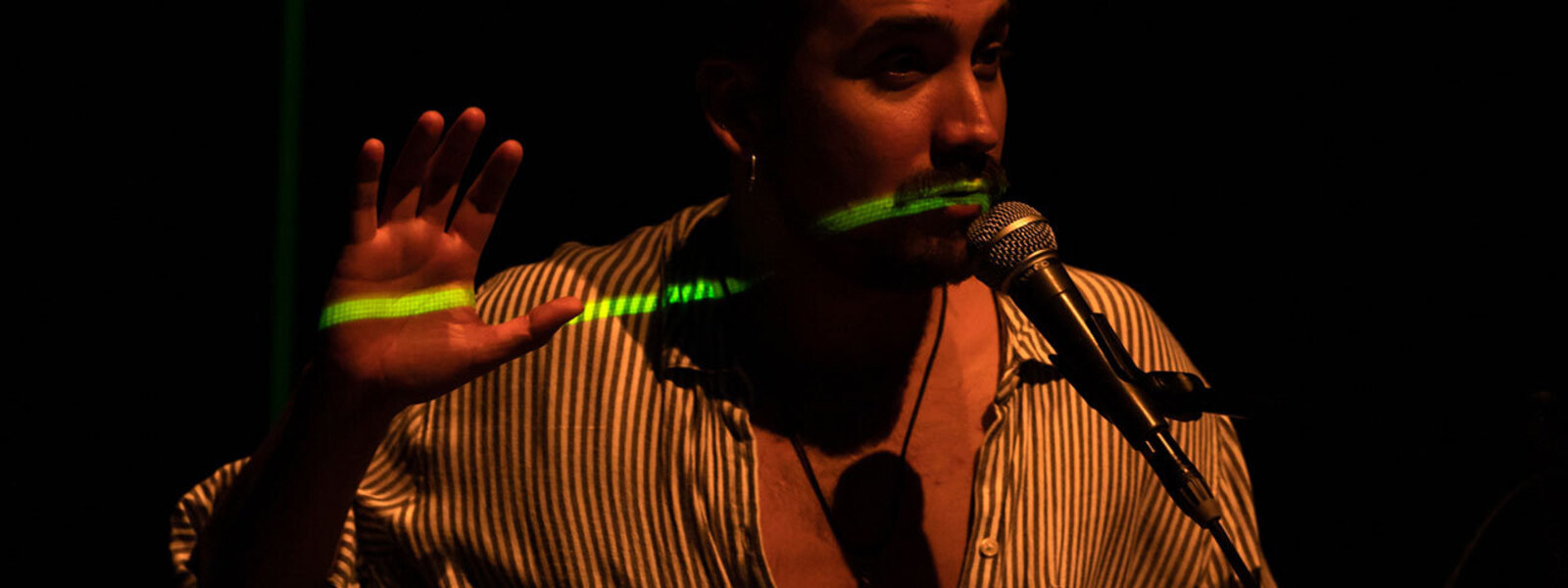 Assis derrière un ordinateur, face au public, il projette des images de ses grands-parents évoquant leurs luttes passées sous la dictature, ou celles d’autres Chiliens relatant leur situation actuelle, souvent précaire. Il relie entre eux les secrets enfouis de son pays. Par le biais de ces fragments de récits, le trentenaire trouve un écho jusqu’en Europe avec ce spectacle.