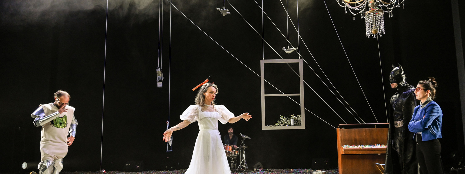 le rythme en live et accompagne les mouvements incessants des quatre interprètes, dans une scénographie colorée.